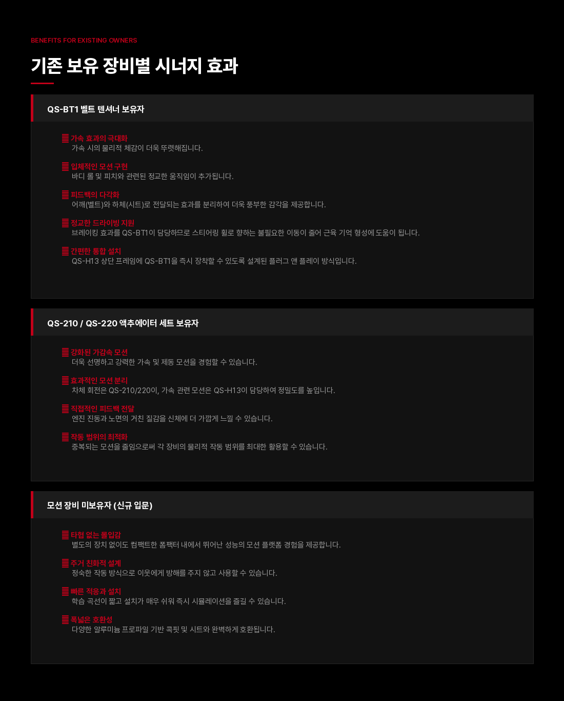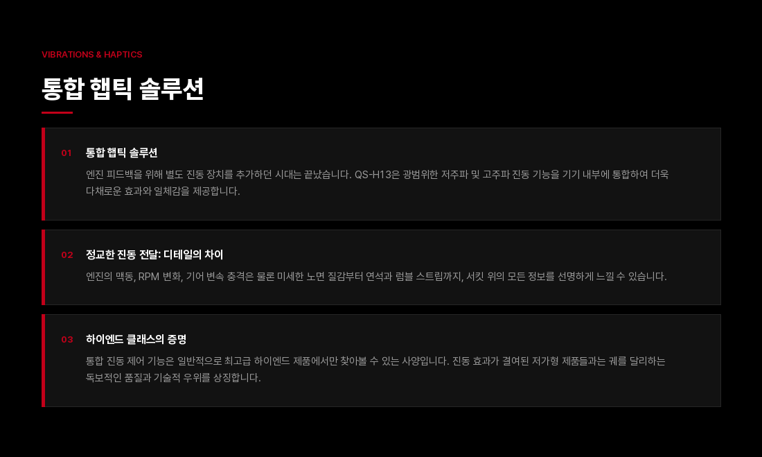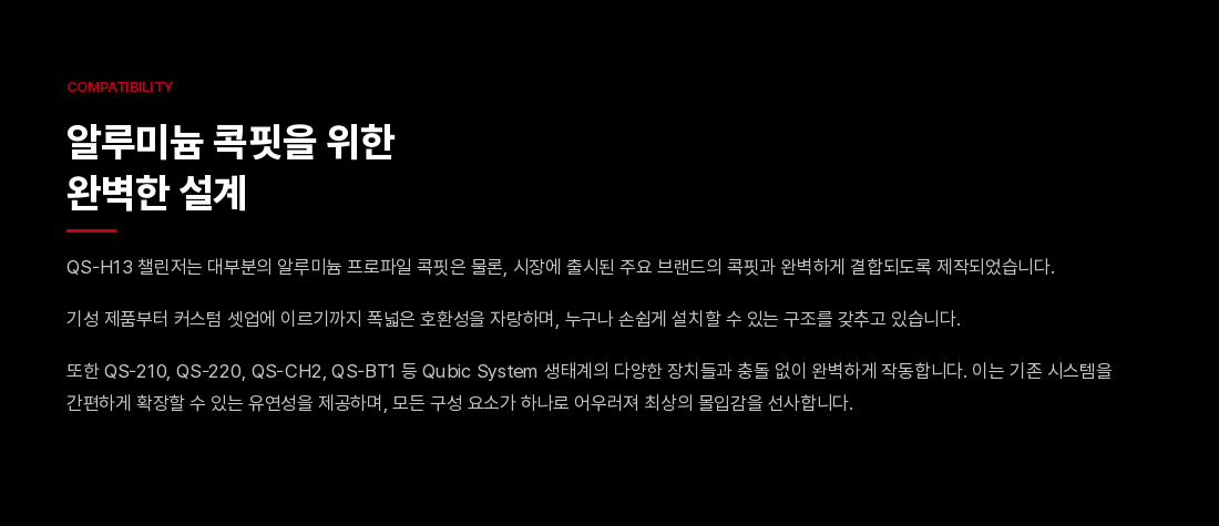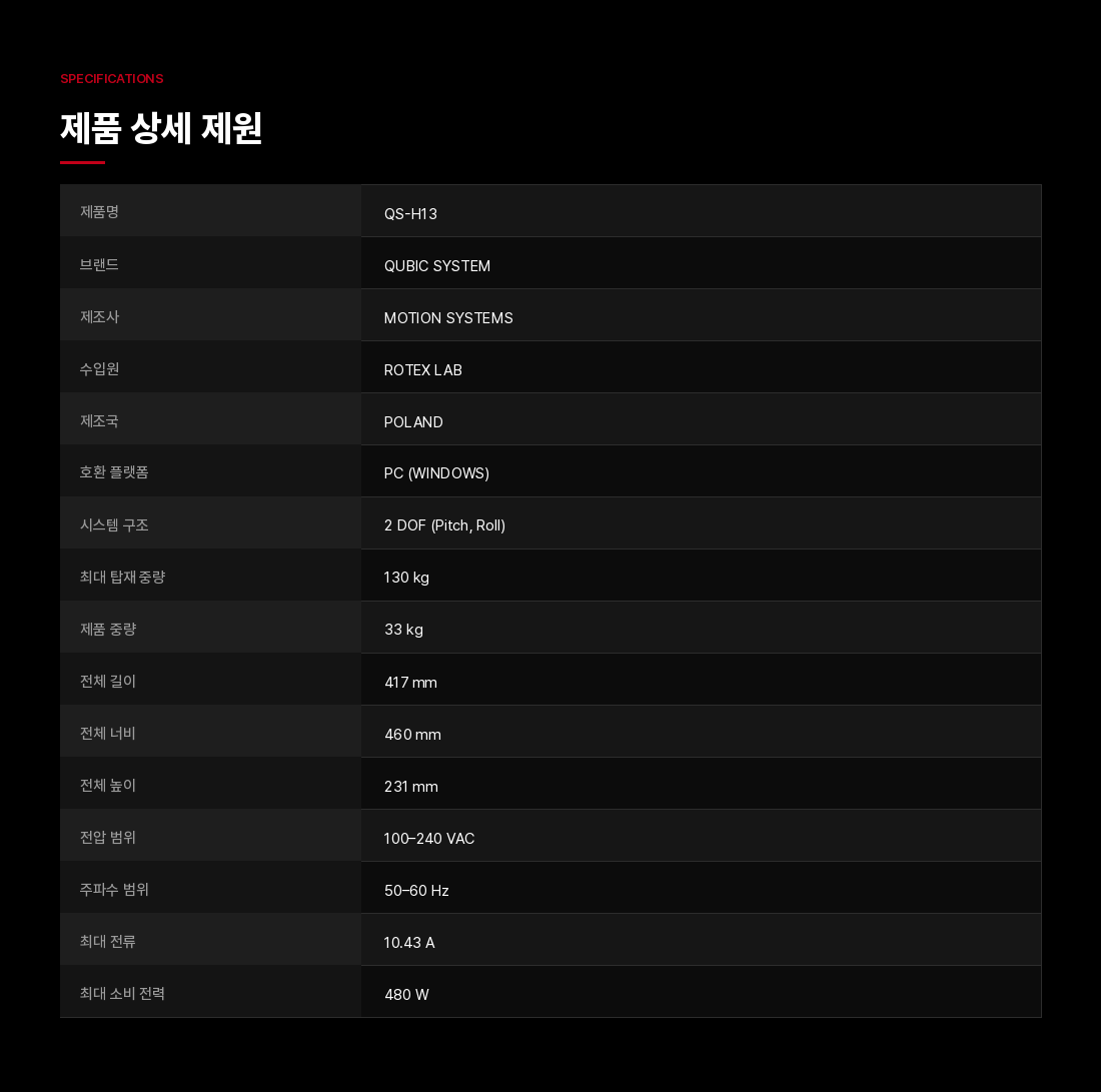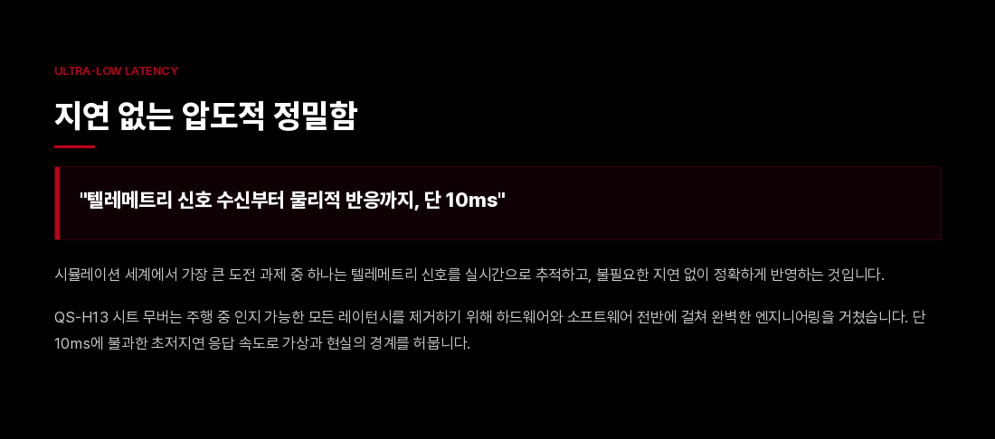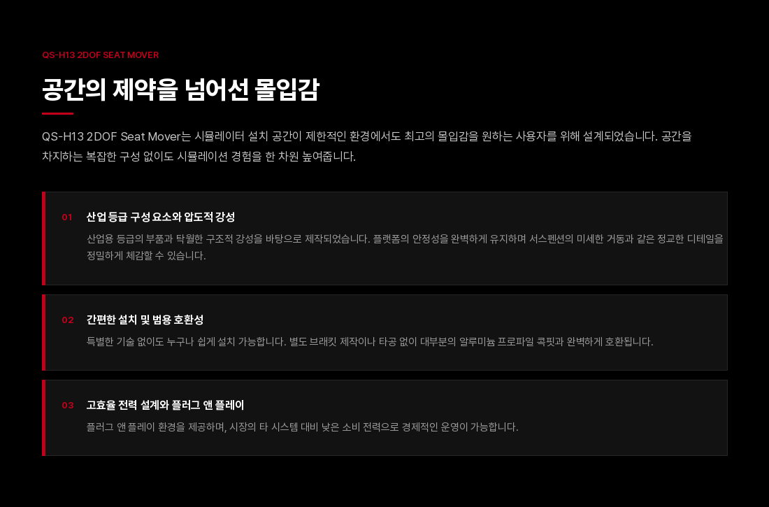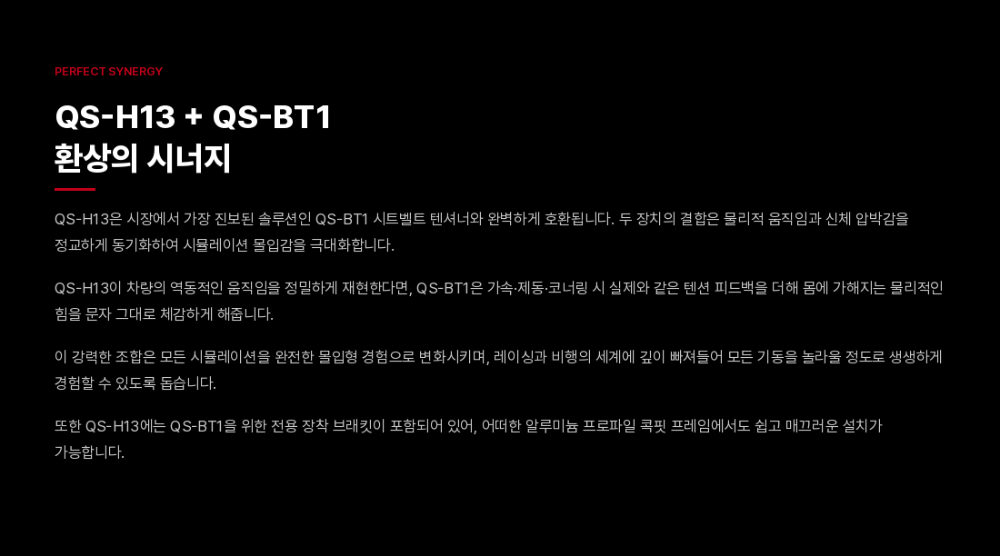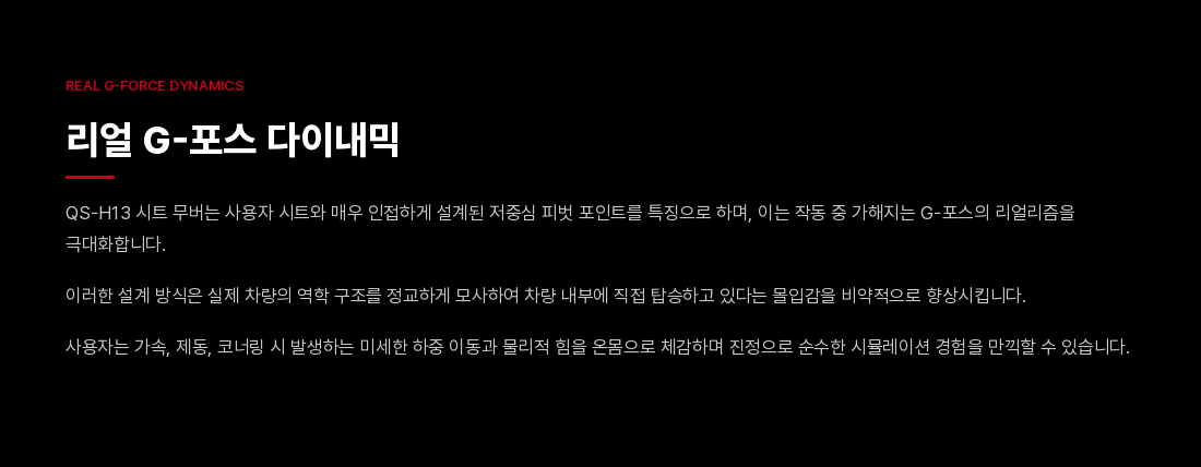 QS-H13 챌린저는 컴팩트하고 극도로 정숙한 솔루션을 원하는 드라이빙 및 비행 시뮬레이터 유저들을 위해 모션 시스템의 새로운 벤치마크를 제시합니다. 두 개의 축(Pitch/Roll)을 가로지르는 매끄럽고 정밀한 움직임을 통해 브레이킹, 코너링, 항공기의 급격한 기동 시 발생하는 물리적 힘을 정확하게 시뮬레이션합니다.
