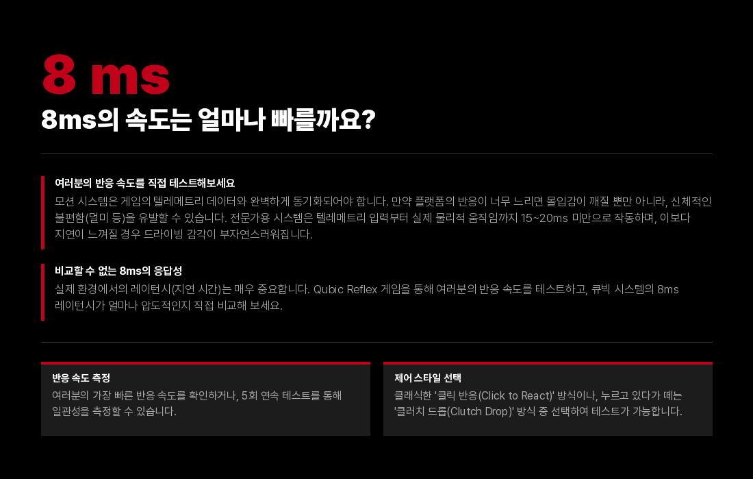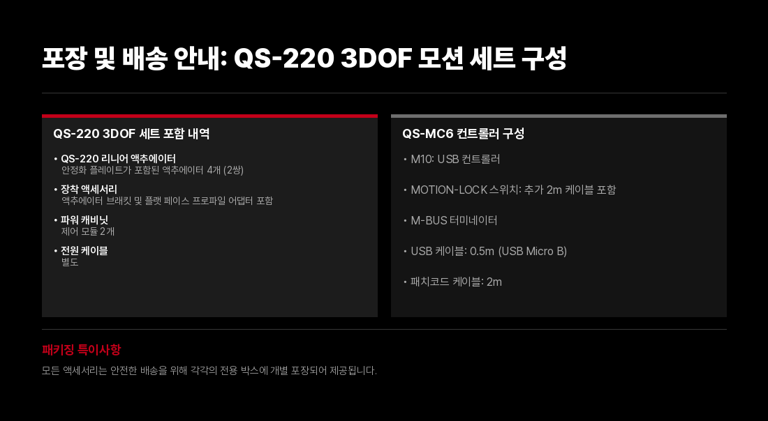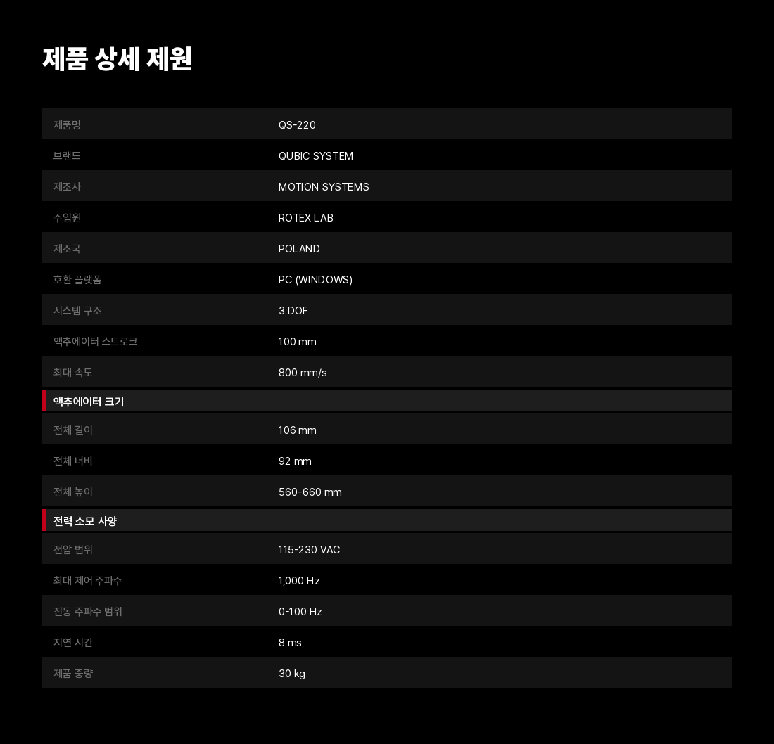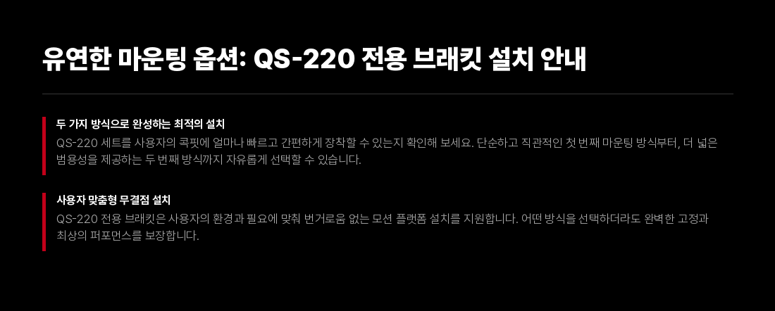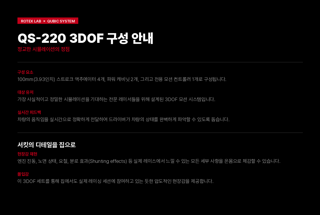 혁신적인 기술, 모듈식 및 소형 설계, 그리고 매우 조용한 운행 덕분에 3DOF QS-220은 전문적인 용도뿐만 아니라 다양한 유형의 조종석에서 가정용 모션 베이스로 완벽한 기초가 되었습니다. 추가 QS-220 세트는 Qubic 시스템 제품군의 전용 조종석으로 구성할 수 있습니다.