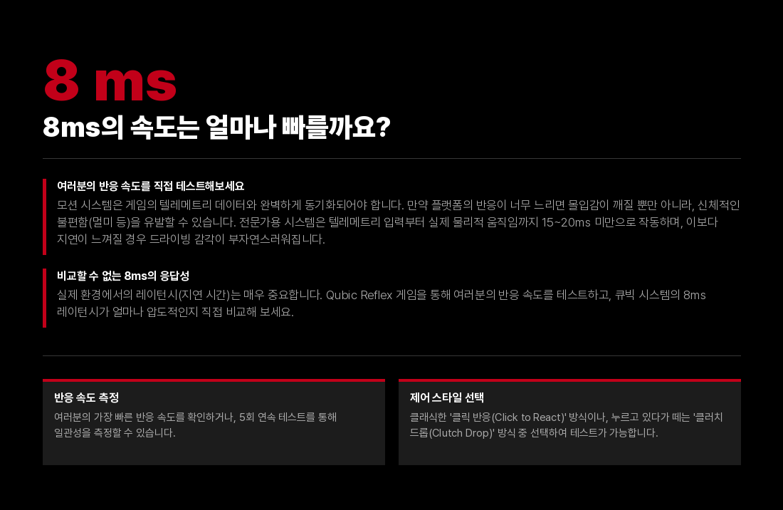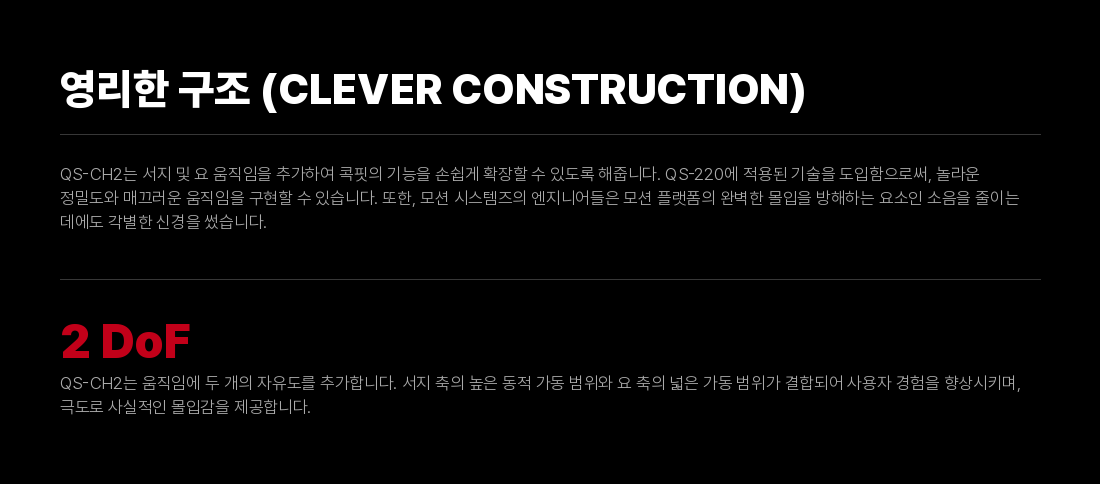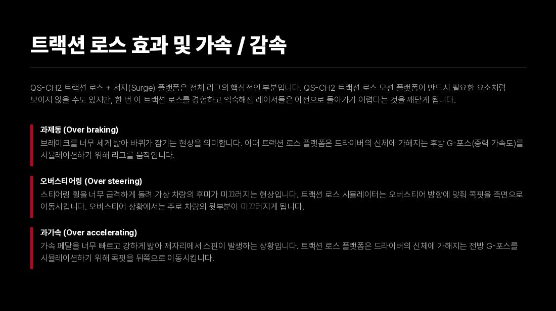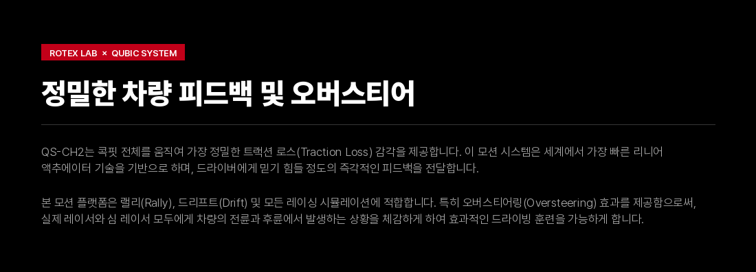 차량의 트랙션 로스, 제동 및 가속 기능을 더욱 정교하게 체감할 수 있도록 서지와 요 모션을 제공하는 2DOF 모션 플랫폼입니다. 세계에서 가장 빠른 리니어 액추에이터 기술을 기반으로 한 이 모션 시스템은 드라이버에게 믿기 힘들 정도의 수준 높은 차량 피드백을 전달합니다. 본 모션 플랫폼은 랠리, 드리프트, GT 및 F1 시뮬레이션에 최적화되어 있습니다. 또한, 큐빅 시스템의 3DOF 액추에이터 세트와 완벽하게 호환됩니다.