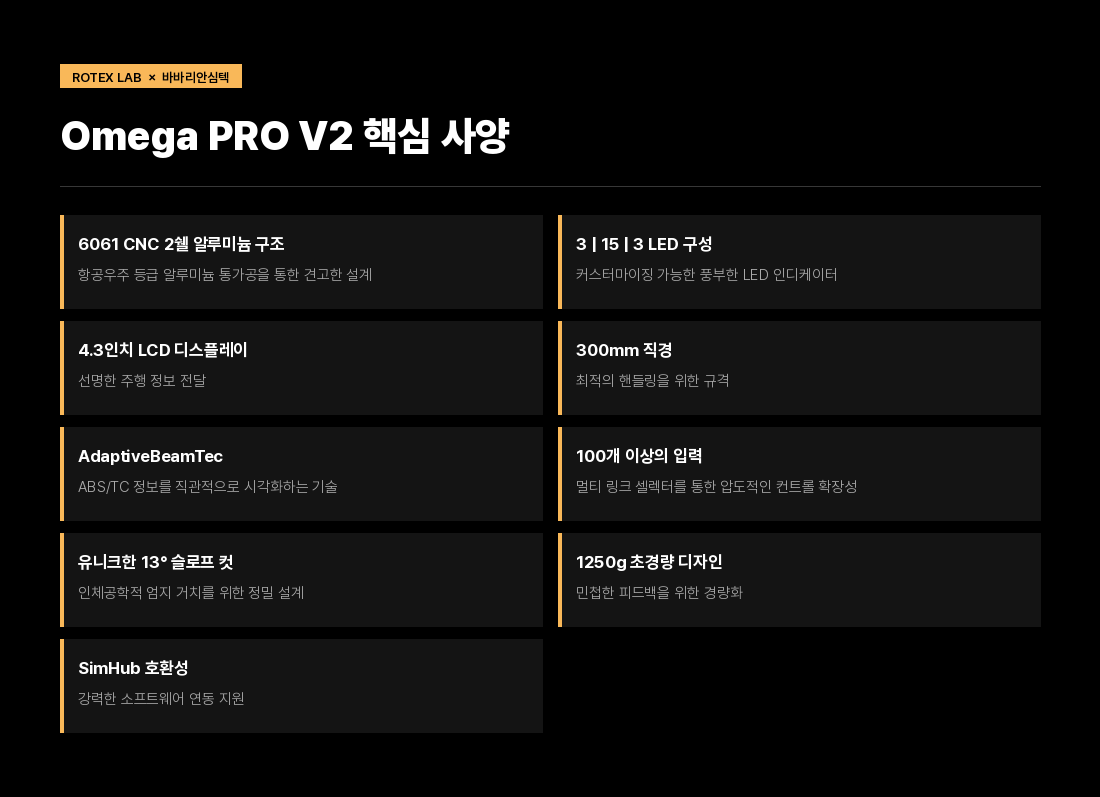 독일의 하이엔드 심레이싱 장비 제조사인 바바리안심텍에서 내놓은 오메가PRO v2는 현존하는 심레이싱 휠 중에서도 '끝판왕'급 성능과 빌드 퀄리티를 자랑하는 제품입니다.